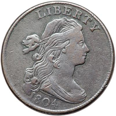 1804 S-266a R4+. Fine-15. Five points sharper but there is uniform extremely faint roughness covering the planchet, and this roughness subdues the natural gloss a bit. There is no verdigris and the only marks are a couple nicks on the shoulder and some faint hairline scratches at TA in STATES. EDS, Breen state I, before any die cracks or cud breaks. The strike is slightly weak at the top of the reverse while everything else is nicely impressed. A quality example of this tough date.