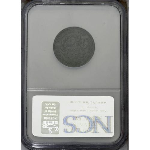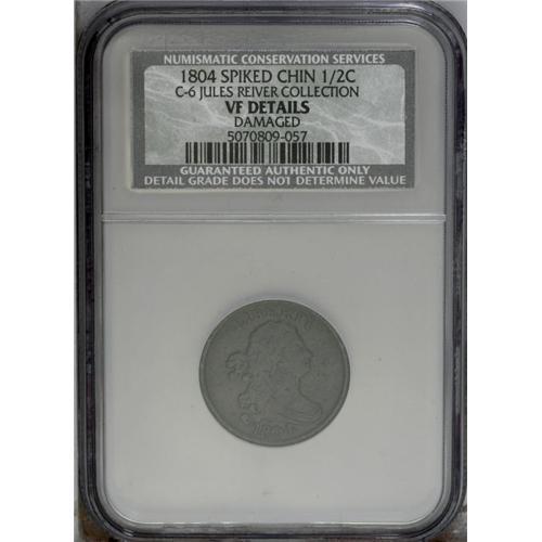 <B>1804<1/2 C> Spiked Chin. C-6, B-6, R.2. Die State 2.2--Damaged--NCS. VF Details. VG10 EAC.</B></I> Braig State 1.5+. Spiked Chin; Wide fraction, low numerator. The crack through the top of A in STATES remains constant. The area over U has merged with the die crack in that area, and is essentially a retained cud with the border dentils still completely visible. Dark olive and mahogany color with light porosity. Aside from a few minor obverse rim bruises and surface marks, the "Damage" per NCS is not readily apparent.<BR><I>Ex: Waltz (8/1980).</B></I> Envelope Included.