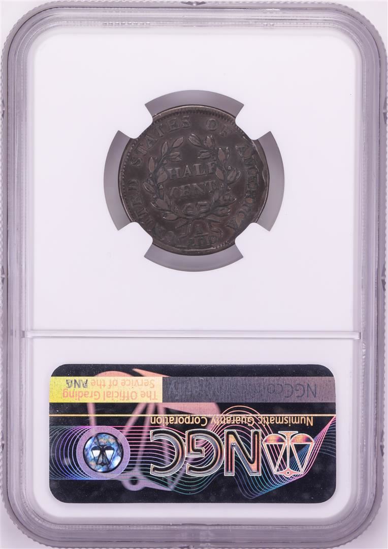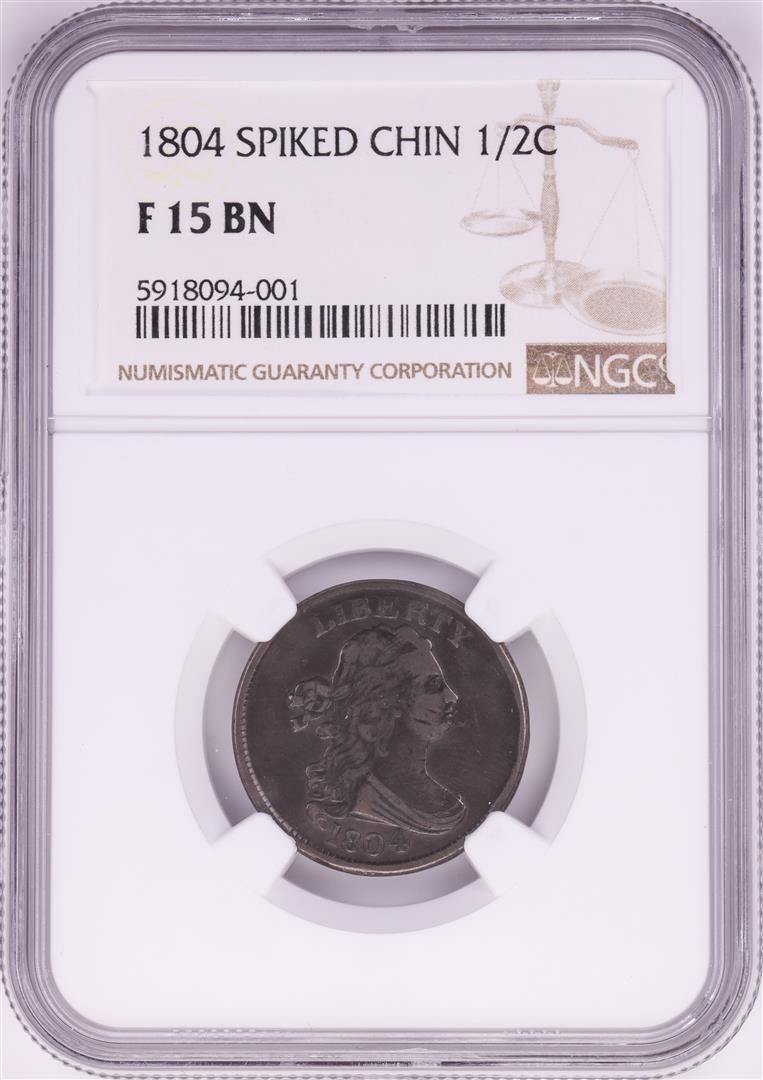 One 1804 Spiked Chin Half Cent Coin NGC F15BN. NGC Certified.