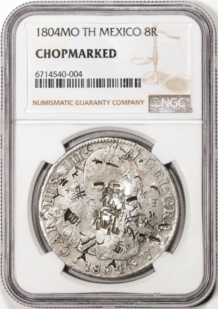 One 1804MO TH Mexico 8 Reales Silver Coin NGC Chopmarked. NGC Certified.