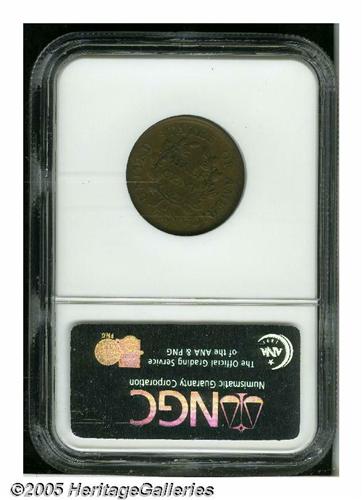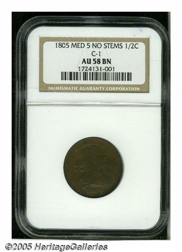 <B>1805<1/2 C> Medium 5, No Stems AU58 Brown NGC.</B></I> B-4, C-4, R.2. Light milk-chocolate example with faint red undertones. Some faint scattered contact marks are noted, but none are severe and the present example possesses a great amount of eye appeal.