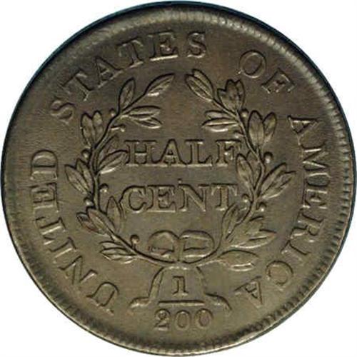 <B>1805<1/2 C> Medium 5, No Stems. C-1, B-1, Low R.2. Die State 1. AU58 NGC. XF45 EAC.</B></I> Medium 5, doubled crossbar; Stemless wreath. The Medium 5, Stemless variety used to be called Small 5, Stemless, but the size of the digit 5 is between the true Small and Large 5 varieties. The flag of the 5 is repunched; this example shows that feature quite clearly. This is an early die state with a short rim break below the right ribbon on the reverse. Also, the centering allows the rim breaks over MER to be visible, an unusual occurrence. The reverse die was used for half cents dated 1804, 1805, and 1806, and this time they were actually used in the same order as the dates appearing on the coins. Quite often, that is not the case. This is a lovely example with lustrous surfaces and medium olive coloration. Splashes of steel toning are visible on the obverse. The surfaces are exceptional.<BR><I>Ex: Unidentified B. Max Mehl sale, lot 109; Harold Bareford; William Bareford (5/25/1984).</B></I> Envelope Included.