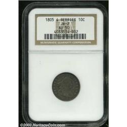<TABLE cellSpacing=0 cellPadding=0 width="100%" bgColor=#000000 border=0><TBODY><TR><TD width="100%"><TABLE cellSpacing=1 cellPadding=3 width="100%" border=0><TBODY><TR><TD width="100%" bgColor=#79735c><FONT face=arial color=#ffffff size=3><B>Description</B> </FONT></TD></TR><TR><TD width="100%" bgColor=#ffffff><FONT face=arial size=2><B>1805 10C 4 Berries AU50 NGC.</B></I> JR-2, R.2. The more obtainable of the two die marriages for the year, each with a unique berry count. Minimally worn with rich gunmetal-gray color and lighter yellow-gold accents. The strike is adequate for the variety and there are a few minor marks on the eagle's shield. </FONT></TD></TR></TBODY></TABLE></TD></TR></TBODY></TABLE><BR><A name=PricesRealized></A><TABLE cellSpacing=0 cellPadding=0 width="100%" bgColor=#000000 border=0><TBODY><TR><TD width="100%"><TABLE cellSpacing=1 cellPadding=3 width="100%" border=0><TBODY><TR><TD width="100%" bgColor=#79735c><A name=PR><FONT face=arial color=#ffffff size=3><B>Previous Prices from Heritage Auctions</B> </FONT></A></TD></TR><TR><TD bgColor=#f6f6ed><TABLE cellSpacing=0 cellPadding=0 width="100%" border=1><TBODY><TR><TD align=middle width="33%"><B>Date</B></TD><TD align=middle width="33%"><B>Service</B></TD><TD align=middle width="33%"><B>Price</B></TD></TR><TR bgColor=whitesmoke><TD width="33%"><B>03/01/1998</B></TD><TD width="33%">PCGS</TD><TD width="33%">$1,980.00</TD></TR><TR bgColor=whitesmoke><TD width="33%"><B>10/05/1994</B></TD><TD width="33%">NGC</TD><TD width="33%">$1,760.00</TD></TR></TBODY></TABLE></TD></TR><TR><TD bgColor=#ffffff><FONT face=arial size=1 ?>PLEASE NOTE: All prices realized reflect the final hammer price PLUS the buyer's premium in auctions that charge a buyer's premium. Each item has a notation at the top of the listing indicating whether that lot included a buyer's premium. Example: A item that sells with a final hammer price of $100 and a 20% buyer's premium will display with a price realized of $120. All information listed is intended to be as accurate as possible, but errors are possible. Please use this guide carefully and inform us of any inaccuracies. </FONT></TD></TR></TBODY></TABLE></TD></TR></TBODY></TABLE><BR><TABLE cellSpacing=0 cellPadding=0 width="100%" bgColor=#000000 border=0><TBODY><TR><TD width="100%"><TABLE cellSpacing=1 cellPadding=3 width="100%" border=0><TBODY><TR><TD width="100%" bgColor=#79735c colSpan=6><FONT face=arial color=#ffffff size=3><B>Price Guide*</B> </FONT></TD></TR><TR bgColor=#f6f6ed><TD align=middle><B>Grade</B> </TD><TD align=middle><B>Coin World<BR>(Trends)</B> </TD><TD align=middle><B>Numismedia<BR>Retail</B> </TD><TD align=middle><B>Numismedia<BR>Wholesale</B> </TD><TD align=middle><B>Coin<BR>Universe</B> </TD><TD align=middle><B>Heritage<BR>Value Index</B> </TD></TR><TR bgColor=#ffffff><TD align=middle>45</TD><TD align=right>---</TD><TD align=right>---</TD><TD align=right>---</TD><TD align=right>---</TD><TD align=right>$1,539.17</TD></TR><TR style="FONT-WEIGHT: bold" bgColor=#cccfdd><TD align=middle>50</TD><TD align=right>$3,000.00</TD><TD align=right>---</TD><TD align=right>$1,950.00</TD><TD align=right>---</TD><TD align=right>$1,794.38</TD></TR><TR bgColor=#ffffff><TD align=middle>53</TD><TD align=right>---</TD><TD align=right>---</TD><TD align=right>$2,100.00</TD><TD align=right>---</TD><TD align=right>$2,130.83</TD></TR><TR bgColor=#ffffff><TD colSpan=6><FONT size=1>*All information listed is intended to be as accurate as possible, but errors are possible. No item may be returned or refused based on this information which is provided as a service to our customers. You should contact each pricing source directly to determine the accuracy of this information. </FONT></TD></TR></TBODY></TABLE></TD></TR></TBODY></TABLE><BR><TABLE cellSpacing=0 cellPadding=0 width="100%" bgColor=#000000 border=0><TBODY><TR><TD width="100%"><TABLE cellSpacing=1 cellPadding=3 width="100%" border=0><TBODY><TR><TD width="100%" bgColor=#79735c><FONT face=arial color=#ffffff size=3><B>Population Guide</B> </FONT></TD></TR><TR bgColor=#ffffff><TD align=middle><!-- Begin Output of Population Grid--><TABLE cellSpacing=0 cellPadding=0 width="100%" border=0><TBODY><TR><TD vAlign=center><TABLE cellSpacing=0 width="100%" border=1 cellsadding="3"><TBODY><TR><TD vAlign=center><TABLE cellSpacing=0 cellPadding=3 width="100%" border=1><TBODY><TR><TD vAlign=center align=middle bgColor=#f0f1e8 colSpan=2 <CENTER><FONT face=Arial size=2><B>PCGS Pop </B></FONT><CENTER></CENTER></TD><TD vAlign=center align=middle bgColor=#f0f1e8 colSpan=2><CENTER><FONT face=Arial size=2><B>NGC Pop</B></CENTER></FONT></TD></TR><TR><TD vAlign=center><FONT face=Arial size=2>(50)</FONT> </TD><TD vAlign=center align=right><FONT face=Arial size=2>13</FONT> </TD><TD vAlign=center><FONT face=Arial size=2>(50)</FONT> </TD><TD vAlign=center align=right><FONT face=Arial size=2>6</FONT> </TD></TR><TR><TD vAlign=center><FONT face=Arial size=2>(>50)</FONT> </TD><TD vAlign=center align=right><FONT face=Arial size=2>115</FONT> </TD><TD vAlign=center><FONT face=Arial size=2>(>50)</FONT> </TD><TD vAlign=center align=right><FONT face=Arial size=2>138</FONT> </TD></TR></TBODY></TABLE></TD></TR></TBODY></TABLE></TD></TR></TBODY></TABLE><!-- End Output of Population Grid--> Important notice: Heritage usually auctions material at the rate of 200-250 lots per hour. On some occasions eBay Live bid software or the Internet may not be able to keep up with the pace of the auction. We recommend placing a realistic absentee bid now as insurance to avoid disappointment. Occasionally the auctioneer may eliminate or reject an eBay Live bid, and the auctioneer may also reopen a lot after the close of the eBay live bidding (usually because we missed an audience bid), and may reject your bid even if it shows you as the winning bidder. By bidding via eBay Live, you agree that Heritage may award the lot to another bidder at its sole discretion under the circumstances described above or any other