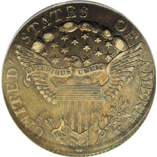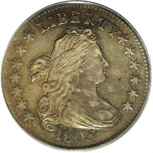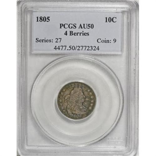 <B>1805 10C 4 Berries AU50 PCGS.</B></I> JR-2, R.2. The slightly more available variety of two for the year, with four olive berries on the branch in the eagle's claw. Light, even wear appears on the well struck devices, and aqua and gold-orange patina drapes still-lustrous surfaces. The coin has a clean appearance overall, though a dig is noted in the right obverse field and a long, thin abrasion crosses the shield on the reverse.<BR><BR><B>Coin Engraver:</B> Robert Scot<BR><BR><b>Shipping:</b> Coins & Currency (<a target="_blank" href="http://www.heritageauctions.com/common/shipping.php">view shipping information</a>\)