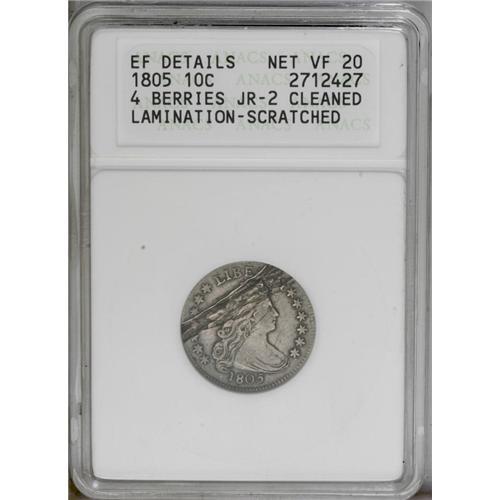 <B>1805<10C> 4 Berries--Cleaned, Lamination, Scratched--ANACS. XF Details, Net VF20.</B></I> JR-2, R.2. A diagonal lamination between 1 and 9 o'clock is relatively deep. A pair of broad pinscratches cross the portrait. The cleaning, however, is mild. A sharply defined early silver type coin.