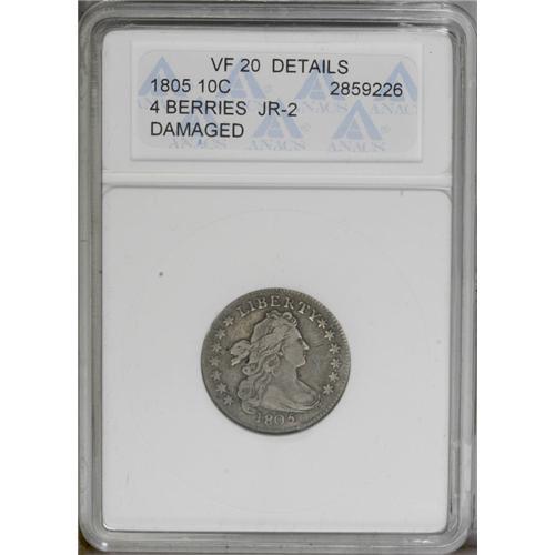 <B>1805<10C> 4 Berries--Damaged--ANACS. VF20 Details.</B></I> JR-2, R.2. Bent near the date and STATES, and a number of wispy scrapes surround the eagle's head. The I in AMERICA has some translucent residue, and the obverse field displays faint pinscratches. Still a nicely detailed silver-gray early type coin.