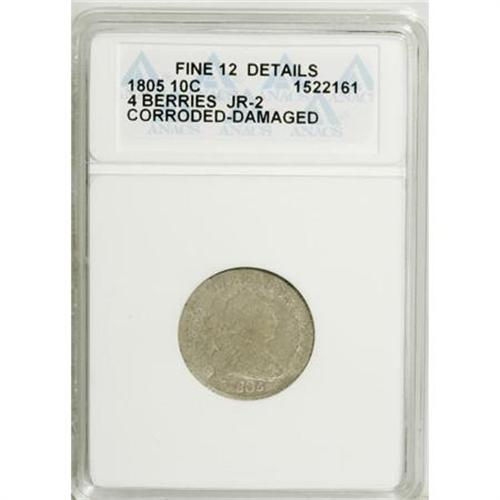 <B>1805 10C 4 Berries--Corroded, Damaged--ANACS. Fine 12 Details.</B></I> JR-2. NGC Census: (16/248). PCGS Population (16/221). Mintage: 120,780. Numismedia Wsl. Price: $675. (#4477)<BR><BR><B>Coin Engraver:</B> Robert Scot<BR><BR><b>Shipping:</b> Coins & Currency (<a target="_blank" href="http://www.heritageauctions.com/common/shipping.php">view shipping information</a>\)