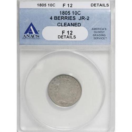 <B>1805 10C 4 Berries--Cleaned--ANACS. Fine 12 Details.</B></I> JR-2. NGC Census: (10/200). PCGS Population (16/232). Mintage: 120,780. Numismedia Wsl. Price for NGC/PCGS coin in F12: $725. (#4477)<BR><BR><B>Coin Engraver:</B> Robert Scot<BR><BR><b>Shipping:</b> Coins & Currency (<a target="_blank" href="http://www.heritageauctions.com/common/shipping.php">view shipping information</a>)