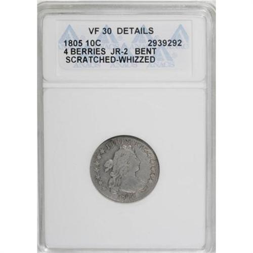 <B>1805 10C 4 Berries--Bent, Scratched, Whizzed--ANACS. VF30 Details.</B></I> JR-2, R.2. Several faded pinscratches traverse the portrait, and other lesser marks are noted on the obverse at 4 o'clock and beneath OF. Both sides are somewhat wavy and have been whizzed to provide a consistent micro-granular appearance.<BR><BR><b>Shipping:</b> Coins & Currency (<a target="_blank" href="http://www.heritageauctions.com/common/shipping.php">view shipping information</a>)