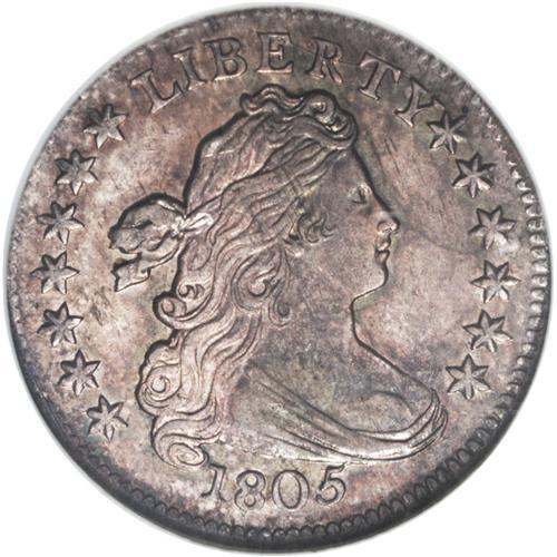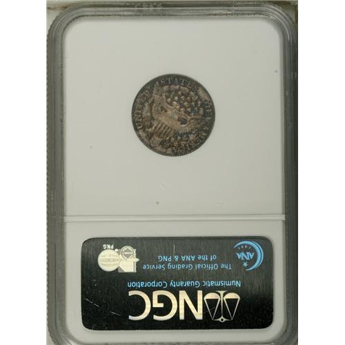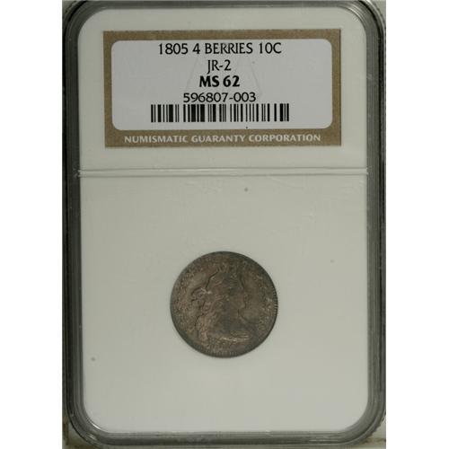 <B>1805 10C 4 Berries MS62 NGC.</B></I> JR-2, R.2. Autumn-brown, ocean-blue, and mauve shades adorn this boldly defined Draped Bust type coin. Generally well struck, with faint mint-made roller marks visible above Liberty's ear and near the upper right shield corner. A smooth and satiny piece, worthy of an advanced early silver type set.<BR><BR><b>Shipping:</b> Coin/Currency (<a target="_blank" href="http://www.heritageauctions.com/common/shipping.php">view shipping information</a>)