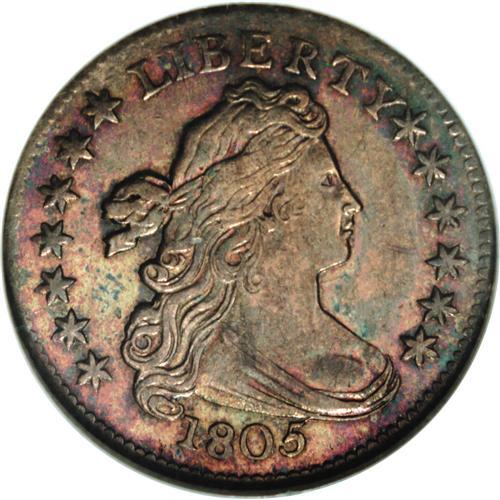 <B>1805 10C 4 Berries MS64 NGC.</B></I> JR-2, R.2. Just two die varieties are known, and they are easily distinguished by the berry count on the reverse with either four berries or five berries. Both varieties were coined from a common obverse die. The five berries variety was struck first, followed by this four berries variety with a thin obverse die crack through ERT.<BR> Bright surfaces display light grayish-lavender with sky-blue accents on the obverse, and aqua-blue, lavender, and champagne-gold on the reverse. The design elements are well impressed, and exhibit good definition in Liberty's hair and drapery and the eagle's wing feathers. Most of the obverse dentilation shows.<BR><BR><b>Shipping:</b> Coin/Currency (<a target="_blank" href="http://www.heritageauctions.com/common/shipping.php">view shipping information</a>)