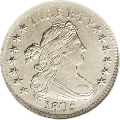 <B>1805<10C> 4 Berries MS65 NGC.</B></I> JR-2, R.2. The dimes of 1805 are one of the most frequently encountered dates of the type, along with the 1796 and 1807. This high grade example has the usual strong definition on Liberty's hair while the eagle's breast and shield are somewhat weakly detailed as is characteristic for this die pairing. Each side shows a bright, silver-gray appearance with bright mint frost. An early Draped Bust dime that is sure to be eagerly sought out by advanced type collectors.