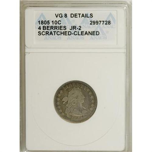 <B>1805 10C 4 Berries--Cleaned, Scratched--ANACS. VG8 Details. </B></I>JR-2.<B> </B></I>NGC Census: (5/211). PCGS Population (8/250). Mintage: 120,780. Numismedia Wsl. Price for NGC/PCGS coin in VG8 : $475. (#4477)<BR><BR><B>Coin Engraver:</B> Robert Scot<BR><BR><b>Shipping:</b> Coins & Currency (<a target="_blank" href="http://www.heritageauctions.com/common/shipping.php">view shipping information</a>)
