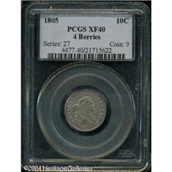 1805 10C 4 Berries XF40 PCGS. JR-2, R.2. Well cent <B>1805 10C 4 Berries XF40 PCGS.</B></I> JR-2, R.2. Well centered, with pleasing silver-gray color. Nicely detailed, though the star centers are mostly flat. A couple of unobscure, trivial marks are not bothersome. <BR><BR><B>Important notice:</B> Heritage usually auctions material at the rate of 200-250 lots per hour. On some occasions eBay Live bid software or the Internet may not be able to keep up with the pace of the auction. We recommend placing a realistic absentee bid now as insurance to avoid disappointment. Occasionally the auctioneer may eliminate or reject an eBay Live bid, and the auctioneer may also reopen a lot after the close of the eBay live bidding (usually because we missed an audience bid), and may reject your bid even if it shows you as the winning bidder. By bidding via eBay Live, you agree that Heritage may award the lot to another bidder at its sole discretion under the circumstances described above or any other reasonable circumstances. Since eBay bids are not shown to us until we open the lot on the floor, we treat those bids just like floor bids. In most cases the floor responds before the eBay bid is presented to us, due to Internet lag time, so for consistency we have made it a policy that floor bids are always considered first over tie eBay live bids. Also please note that all Heritage lots purchased through eBay Live carry a 20% Buyer's Premium. Please make sure you read the Terms and Conditions before you bid. This lot is being auctioned in conjunction with a live floor auction by Heritage Galleries & Auctioneers. All final auction and invoice information will be supplied by Heritage Galleries & Auctioneers, and all other information should be considered preliminary. Lot:5702