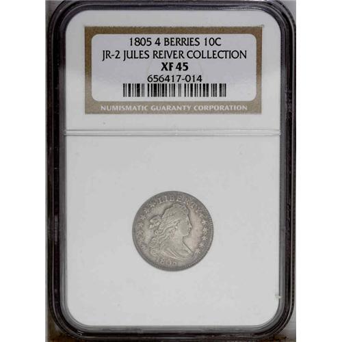 <B>1805<10C> 4 Berries JR-2, R.2. Reiver state b. XF45 NGC.</B></I> A later die state of the common variety, with the die crack through ERTY on the obverse, and a new die crack to the star above and right of the eagle's head, and clash marks above the motto from her bust. Portions of the date are clashed below STAT of STATES. A lovely coin that boasts light silver devices with gold and blue in the fields. Faint hairlines are seen on the obverse, but no other surface nicks, cuts or scratches are apparent. Although a common variety, this coin is very nice for the grade.<BR><I>Ex: Jim McGuigan (June 1984); Sarasota Coin.</B></I> Envelope Included.