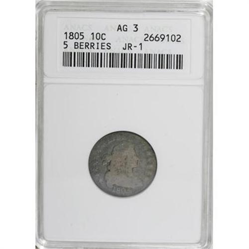 <B>1805 10C 5 Berries AG3 ANACS.</B></I> JR-1. NGC Census: (0/0). PCGS Population (2/17). (#4478)<BR><BR><B>Coin Engraver:</B> Robert Scot<BR><BR><b>Shipping:</b> Coins & Currency (<a target="_blank" href="http://www.heritageauctions.com/common/shipping.php">view shipping information</a>)