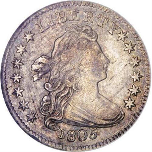 <B>1805 10C 5 Berries AU50 NGC.</B></I> JR-1, R.3. A charming dove-gray Heraldic Eagle type coin with ample satin luster and an unmarked appearance. Slightly soft on the reverse center, but the remainder of the design is bold. One of only two 1805-dated varieties, and each receives separate Guide Book listing.<BR><I>From The Casa Becca del Norté Collection.</B></I><BR><BR><B>Coin Engraver:</B> Robert Scot<BR><BR><b>Shipping:</b> Coins & Currency (<a target="_blank" href="http://www.heritageauctions.com/common/shipping.php">view shipping information</a>)