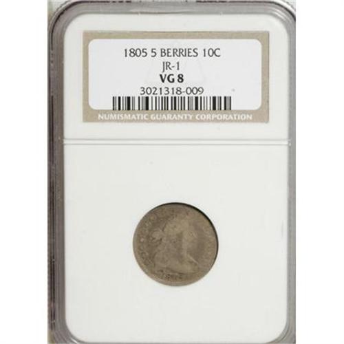 <B>1805 10C 5 Berries VG8 NGC.</B></I> JR-1, R.3. The only Five Berries variety. Though significantly worn, this rose-accented slate-gray representative is pleasing. The surfaces show no flaws of note, and the overall quality is delightful for the grade assigned.<BR><BR><B>Coin Engraver:</B> Robert Scot<BR><BR><b>Shipping:</b> Coins & Currency (<a target="_blank" href="http://www.heritageauctions.com/common/shipping.php">view shipping information</a>)