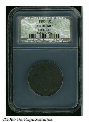 <B>1805<1C> AU Details, Corroded, NCS.</B></I> S-267, R.1. Blunt 1 in date. A bold but granular charcoal-gray example. There are no consequential marks. Only three Sheldon marriages are known for this conditionally scarce date.