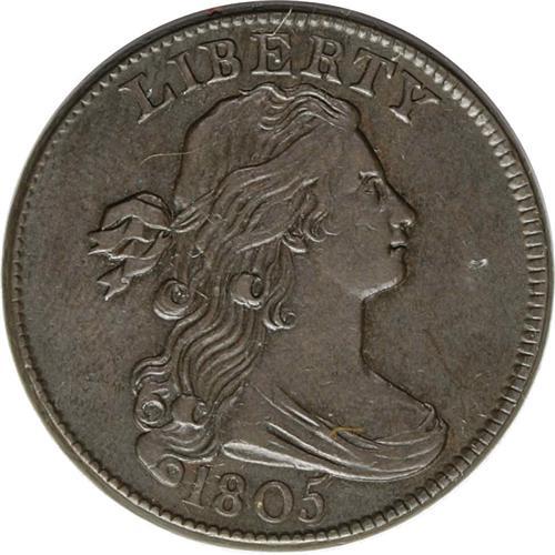 <B>1805<1C> S-267, B-1, R.1. AU55 NGC. VF35 EAC.</B></I> Die State III. Blunt 1. Recutting on the 5 is bold. The highest leaf points to the left side of the last S in STATES. This example is a lightly circulated and intricately detailed specimen, showing clear delineation of Liberty's hair from her face all across her forehead and down to the tips of her forecurl. The reverse leaf pairs show an uncommon level of separation. Marks are few and unworthy of singular mention, and the planchet is glossy olive-brown. A faint reverse die crack runs through the tops of AME on this example. A delectable type or date representative that should merit a strong bid.<BR><I>Ex: George Ramont.</B></I> Envelope Included.