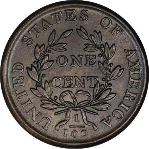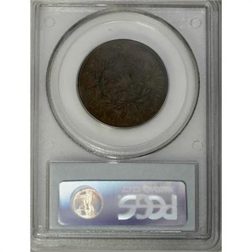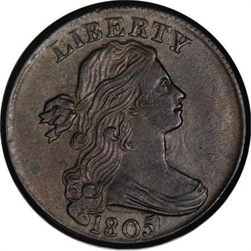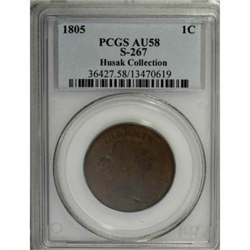 <B>1805 1C AU58 PCGS. S-267, B-1, R.1. </B></I> <B>Noyes XF45; CC-21. Photo #39661. Our EAC Grade XF45.<BR><BR>Equivalents. </B></I>Proskey 1; Doughty 199; McGirk 1A; Clapp 1; EAC 1; <I>Encyclopedia </B></I>1765; PCGS #1510.<BR><B><BR>Variety. </B></I>Blunt 1. High leaf below left corner of S. The obverse appears on S-267 and S-268. The reverse appears on S-267.<BR><B><BR>Surfaces.</B></I> The chestnut obverse and olive reverse retain considerable luster with few imperfections of any kind. Both sides have hints of iridescent toning. The strike is typical, with good central detail but weak borders that show little definition.<BR><B><BR>Die State II. </B></I>Minor obverse and reverse clash marks.<BR><B><BR>Census. </B></I>Several Mint State coins are known, but none stand above the rest. A number of counterfeits of S-267 exist, produced on the West Coast a couple decades ago. Jack Beymer discovered the first of these in 1985. Differences are minor, but sufficient that they fail to deceive advanced collectors or dealers. A diamond-shaped hollow at the temple, and unusual beveled edges, are a couple of the characteristics that the counterfeit pieces display.<BR><B><BR>Commentary. </B></I>Only two obverse and two reverse dies were used to produce three varieties for the year. Mint records suggest a mintage of over 900,000 coins during the year, an average of 450,000 coins per die, if all were dated 1805. Most likely, some were dated 1803 or perhaps 1804.<BR><B><BR>Provenance. </B></I><I>Acquired 3/1997. No prior provenance is currently available.</B></I><BR><BR><b>Shipping:</b> Coins & Currency (<a target="_blank" href="http://www.heritageauctions.com/common/shipping.php">view shipping information</a>)