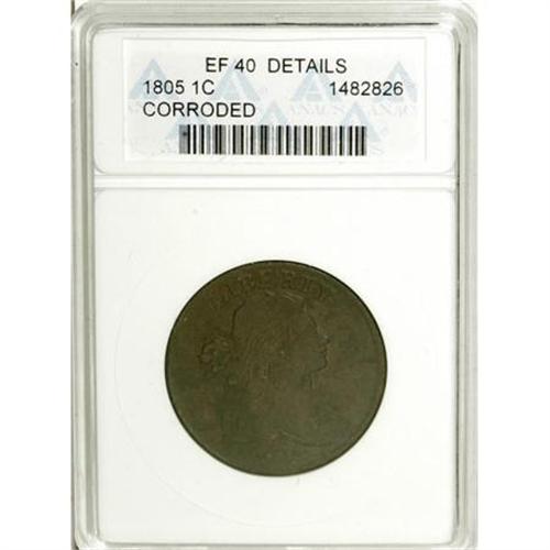 <B>1805 1C --Corroded--ANACS. XF40 Details.</B></I> NGC Census: (3/56). PCGS Population (8/46). Mintage: 941,116. Numismedia Wsl. Price: $675. (#1510)<BR><BR><B>Coin Engraver:</B> Robert Scot<BR><BR><b>Shipping:</b> Coins & Currency (<a target="_blank" href="http://www.heritageauctions.com/common/shipping.php">view shipping information</a>\)