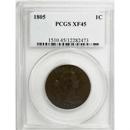 <B>1805 1C XF45 PCGS.</B></I> S-267, B-1. An early stage of Breen Die State II, showing faint clash marks at the throat and ribbon. The smooth, medium walnut-brown surfaces are choice on this well detailed, eye-pleasing Draped Bust large cent. Population: 8 in 45, 40 finer (12/07). EAC 30.<BR><BR><B>Coin Engraver:</B> Robert Scot<BR><BR><b>Shipping:</b> Coins & Currency (<a target="_blank" href="http://www.heritageauctions.com/common/shipping.php">view shipping information</a>)