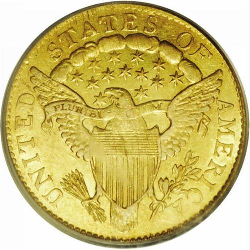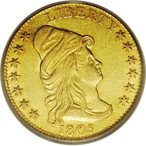 <B>1805<$2 1/2> AU58 PCGS.</B></I> Breen-6121, Bass-3012, R.4. Only one die pair is known for the rare 1805 quarter eagle, which is usually encountered in circulated grades. This near-Mint piece has luster throughout the borders and within recessed areas of the devices. Refreshingly undisturbed by contact, some adjustment marks affect the center of the reverse but do not alter the technical grade. The centers have minor softness of strike, while the remainder of the design is bold. All in all, an impressive example of this rare type, and a good selection for the collector who seeks to balance quality and affordability. Population: 13 in 58, 7 finer (4/06).