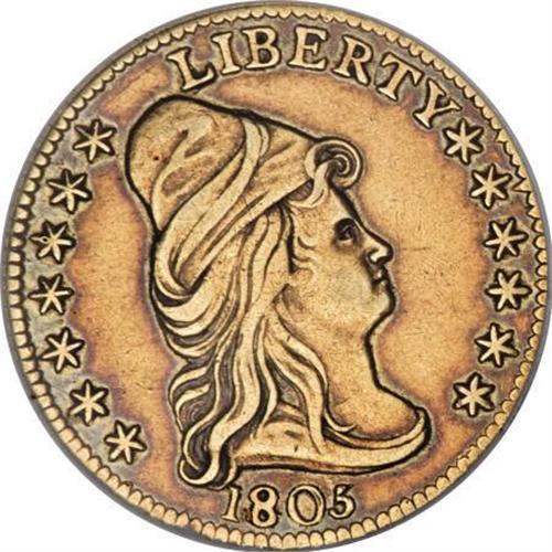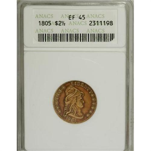 <B>1805 $2 1/2 XF45 ANACS.</B></I> Breen-6121, BD-1, R.4. Bass-Dannreuther Die State b/a. The rich orange fields contrast slightly with the apricot-gray devices and lime-tinted margins. The right reverse field has a couple of faint, slender abrasions. The upper reverse has minor adjustment marks, as made.<BR><BR><B>Coin Engraver:</B> Robert Scot<BR><BR><b>Shipping:</b> Coins & Currency (<a target="_blank" href="http://www.heritageauctions.com/common/shipping.php">view shipping information</a>)