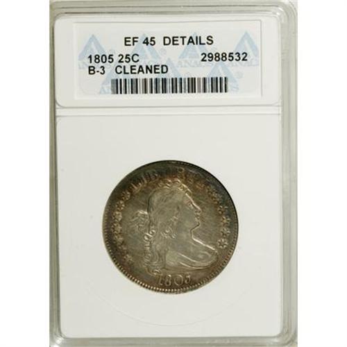 <B>1805 25C --Cleaned--ANACS. XF45 Details.</B></I> B-3, R.1. Although the surfaces have light hairlines, this piece exhibits pleasing peripheral gold and blue toning on both sides. The reverse has light die cracks through the tops of some letters, along with prominent clash marks from the drapery.<BR><BR><b>Shipping:</b> Coins & Currency (<a target="_blank" href="http://www.heritageauctions.com/common/shipping.php">view shipping information</a>)