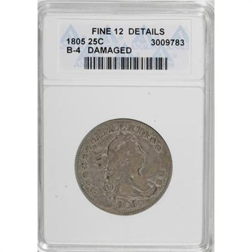 <B>1805 25C --Damaged--ANACS. Fine 12 Details. </B></I>B-4.<B> </B></I>NGC Census: (20/132). PCGS Population (30/184). Mintage: 121,394. Numismedia Wsl. Price for NGC/PCGS coin in F12: $525. (#5313)<BR><BR><B>Coin Engraver:</B> Robert Scot<BR><BR><b>Shipping:</b> Coins & Currency (<a target="_blank" href="http://www.heritageauctions.com/common/shipping.php">view shipping information</a>)
