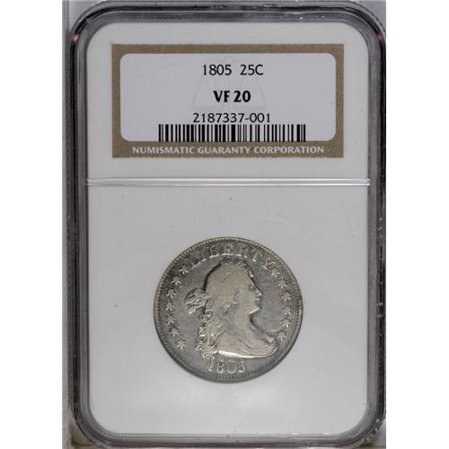<B>1805<25C> VF20 NGC.</B></I> B-4, R.3. This bright slate-gray Draped Bust quarter is softly struck on the shield, but all letters in E PLURIBUS UNUM are at least partly visible. Handling marks are fewer than expected of the grade.
