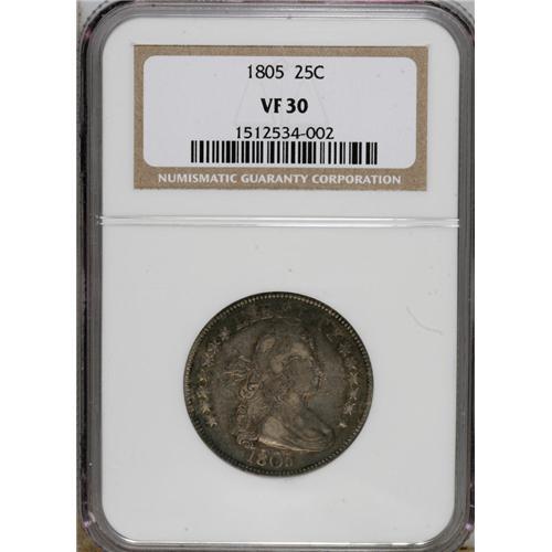 <B>1805 25C VF30 NGC.</B></I> B-2, R.3. This deep gunmetal-gray and powder-blue Draped Bust quarter has pleasing definition on the eagle's wings, and each side has only a couple of unimportant marks. Portions of the designs are softly brought up, characteristic of the type.<BR><BR><b>Shipping:</b> Coins & Currency (<a target="_blank" href="http://www.heritageauctions.com/common/shipping.php">view shipping information</a>)