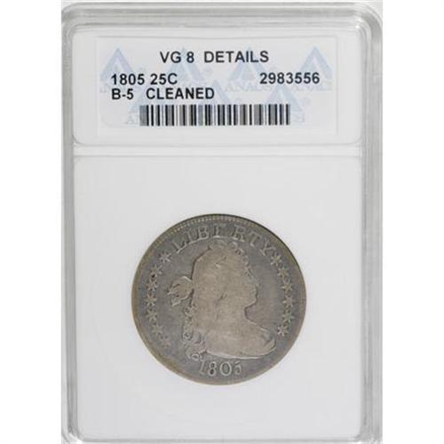 <B>1805 25C --Cleaned--ANACS. VG8 Details.</B></I> B-5, R.5. This very scarce variety was unknown to Browning. A minutely granular pearl-gray quarter with pleasing definition on the horizontal shield lines. The tops of UNI are slightly weak, but the remainder of the peripheral stars and letters are clear.<BR><BR><b>Shipping:</b> Coins & Currency (<a target="_blank" href="http://www.heritageauctions.com/common/shipping.php">view shipping information</a>)