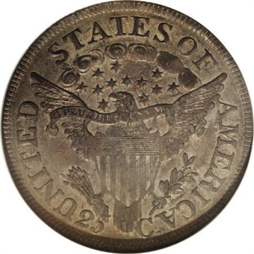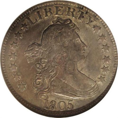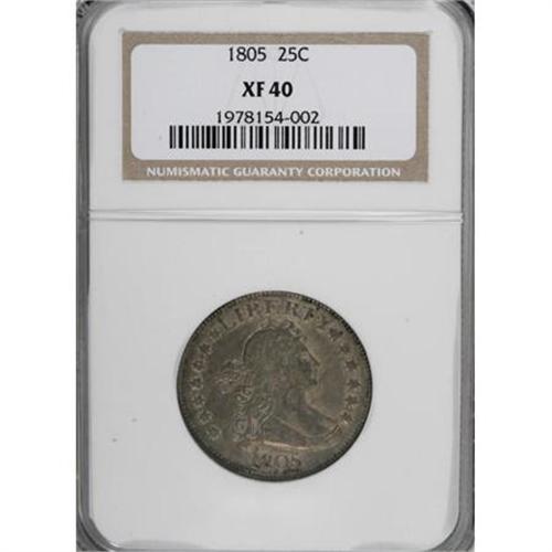 <B>1805 25C XF40 NGC.</B></I> B-4, R.3. Deep orange, yellow-green, and plum-red tints emerge when this lightly abraded early quarter is rotated beneath a light. The strike on the shield and opposite curls is typically indistinct, but the wing plumage is bold and lustrous. From an early die state without the clash mark through the O in OF.<BR><BR><B>Coin Engraver:</B> Robert Scot<BR><BR><b>Shipping:</b> Coins & Currency (<a target="_blank" href="http://www.heritageauctions.com/common/shipping.php">view shipping information</a>)
