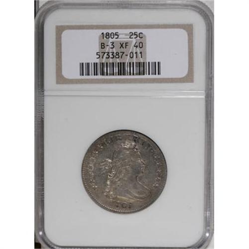 <B>1805 25C XF40 NGC.</B></I> B-3, R.1. An attractive, lightly circulated example of this common Browning variety, silver-gray in color, and with traces of luster in the recesses. Heavy clashing (as struck) is evident, particularly on the reverse, although a clash with the eagle's tailfeathers also causes the E in LIBERTY to appear weak. A few of the stars above the eagle's head are weakly struck, as always.<BR><BR><B>Coin Engraver:</B> Robert Scot<BR><BR><b>Shipping:</b> Coins & Currency (<a target="_blank" href="http://www.heritageauctions.com/common/shipping.php">view shipping information</a>)