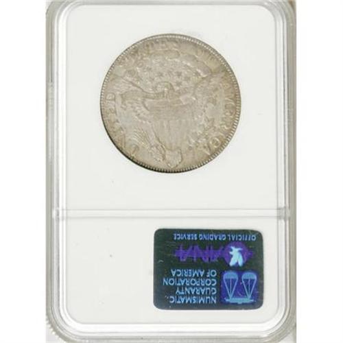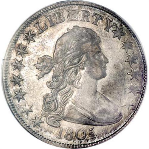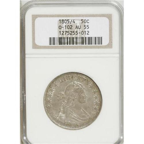 <B>1805/4 50C AU55 NGC.</B></I> O-102, R.3. This reverse is easily differentiated from Obverse 1 by the lack of the half berry, the top and bottom berries lacking a stem, and the middle two berries having long stems. Additionally, the inner right serif of the A's are broken off. This reverse die was also used for O-108, 110, and 114 with little evidence of further deterioration.<BR> This is an important early die state with no evidence of the usual die crack on the obverse from the border through star 2. The curved die lines below the date are constant, as on O-101. The reverse has a crack from the border to the left serif of the U in UNITED, another at the tops of TES, and a third from the right wing tip to the tops of AME. <BR> Pleasing light pewter-gray surfaces are accented by hints of gold and iridescent toning on each side. Nearly full luster remains evident with trivial surface marks of little significance. Second finest of those that have been sold in recent years. An NGC AU58 has appeared in three different sales recently, and the next best to appear in auction this century is an AU50 that failed to find a buyer.<BR> Haseltine-1; Beistle 1-B; Overton-3; PCGS# 39291; Encyclopedia-4574.<BR><I>Ex: Michael Summers (2001).<BR>From The Westmoreland County Collection of Early Bust Halves, 1794-1807.</B></I><BR><BR><B>Coin Engraver:</B> Robert Scot<BR><BR><b>Shipping:</b> Coins & Currency (<a target="_blank" href="http://www.heritageauctions.com/common/shipping.php">view shipping information</a>)
