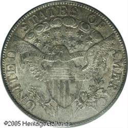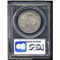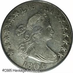<B>1805/4 50C AU55 PCGS.</B></I> O-103, R.5. This is the rare overdate variety, and is an early die state example without evidence of the triangular die crack sometimes seen at the lower left obverse. A hairline crack begins just left of Liberty's middle hair curls, and curves up through the hair and across the cheek, eventually to star 8 and the Y, to the border. The O-103 variety Is immediately recognized by the wide separation between the lower hair curls and the first star. This is also a "complete" overdate with all of the digit 4 visible beneath the final 5. It is almost certainly the case that this is the single finest known example of the variety. This same coin has been offered for sale at auction three different times in the past four years, reaching a record sale of $23,000 in the 2003 ANA sale.<BR> Both sides have light silvery-gray surfaces with nearly complete luster. A few faint hairlines are to be expected for a coin from this era. Otherwise, the surfaces are quite pleasing overall. Both sides have mottled peripheral toning with pale gold and light blue colors. Lot:6923
