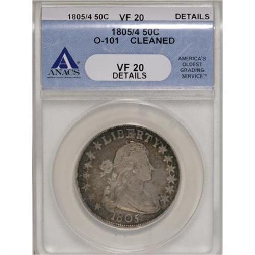<B>1805/4 50C --Cleaned--ANACS. VF20 Details.</B></I> O-101. NGC Census: (5/67). PCGS Population (14/79). Numismedia Wsl. Price for NGC/PCGS coin in VF20: $1,050. (#6070)<BR><BR><B>Coin Engraver:</B> Robert Scot<BR><BR><b>Shipping:</b> Coins & Currency (<a target="_blank" href="http://www.heritageauctions.com/common/shipping.php">view shipping information</a>)