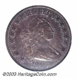 <TABLE cellSpacing=0 cellPadding=0 width="100%" bgColor=#000000 border=0><TBODY><TR><TD width="100%"><TABLE cellSpacing=1 cellPadding=3 width="100%" border=0><TBODY><TR><TD width="100%" bgColor=#79735c><FONT face=arial color=#ffffff size=3><B>Description</B> </FONT></TD></TR><TR><TD width="100%" bgColor=#ffffff><FONT face=arial size=2><B>1805/4 50C XF45 NGC.</B></I> O-101, R.3. The underdigit 4 is unmistakable. Rich copper-gold and mauve patina embraces this richly detailed example. The stars and wingtips are typically struck, but the devices are sharp. The right obverse field has a few relatively inconsequential ticks, but certainly a pleasing Bust Half for the grade, as the margins and recessed devices provide significant faded luster. Population: 11 in 45, 11 finer (7/03). </FONT></TD></TR></TBODY></TABLE></TD></TR></TBODY></TABLE><BR><A name=PricesRealized></A><TABLE cellSpacing=0 cellPadding=0 width="100%" bgColor=#000000 border=0><TBODY><TR><TD width="100%"><TABLE cellSpacing=1 cellPadding=3 width="100%" border=0><TBODY><TR><TD width="100%" bgColor=#79735c><A name=PR><FONT face=arial color=#ffffff size=3><B>Previous Prices from Heritage Auctions</B> </FONT></A></TD></TR><TR><TD bgColor=#f6f6ed><TABLE cellSpacing=0 cellPadding=0 width="100%" border=1><TBODY><TR><TD align=middle width="33%"><B>Date</B></TD><TD align=middle width="33%"><B>Service</B></TD><TD align=middle width="33%"><B>Price</B></TD></TR><TR bgColor=whitesmoke><TD width="33%"><B>03/01/1999</B></TD><TD width="33%">NGC</TD><TD width="33%">$1,955.00</TD></TR></TBODY></TABLE></TD></TR><TR><TD bgColor=#ffffff><FONT face=arial size=1 ?>PLEASE NOTE: All prices realized reflect the final hammer price PLUS the buyer's premium in auctions that charge a buyer's premium. Each item has a notation at the top of the listing indicating whether that lot included a buyer's premium. Example: A item that sells with a final hammer price of $100 and a 20% buyer's premium will display with a price realized of $120. All information listed is intended to be as accurate as possible, but errors are possible. Please use this guide carefully and inform us of any inaccuracies. </FONT></TD></TR></TBODY></TABLE></TD></TR></TBODY></TABLE><BR><TABLE cellSpacing=0 cellPadding=0 width="100%" bgColor=#000000 border=0><TBODY><TR><TD width="100%"><TABLE cellSpacing=1 cellPadding=3 width="100%" border=0><TBODY><TR><TD width="100%" bgColor=#79735c colSpan=6><FONT face=arial color=#ffffff size=3><B>Price Guide*</B> </FONT></TD></TR><TR bgColor=#f6f6ed><TD align=middle><B>Grade</B> </TD><TD align=middle><B>Coin World<BR>(Trends)</B> </TD><TD align=middle><B>Numismedia<BR>Retail</B> </TD><TD align=middle><B>Numismedia<BR>Wholesale</B> </TD><TD align=middle><B>Coin<BR>Universe</B> </TD><TD align=middle><B>Heritage<BR>Value Index</B> </TD></TR><TR bgColor=#ffffff><TD align=middle>40</TD><TD align=right>$1,725.00</TD><TD align=right>---</TD><TD align=right>---</TD><TD align=right>$1,450.00</TD><TD align=right>$1,070.83</TD></TR><TR style="FONT-WEIGHT: bold" bgColor=#cccfdd><TD align=middle>45</TD><TD align=right>$3,750.00</TD><TD align=right>---</TD><TD align=right>---</TD><TD align=right>---</TD><TD align=right>$1,988.89</TD></TR><TR bgColor=#ffffff><TD align=middle>50</TD><TD align=right>$6,500.00</TD><TD align=right>---</TD><TD align=right>---</TD><TD align=right>---</TD><TD align=right>$3,076.11</TD></TR><TR bgColor=#ffffff><TD colSpan=6><FONT size=1>*All information listed is intended to be as accurate as possible, but errors are possible. No item may be returned or refused based on this information which is provided as a service to our customers. You should contact each pricing source directly to determine the accuracy of this information. </FONT></TD></TR></TBODY></TABLE></TD></TR></TBODY></TABLE><BR><TABLE cellSpacing=0 cellPadding=0 width="100%" bgColor=#000000 border=0><TBODY><TR><TD width="100%"><TABLE cellSpacing=1 cellPadding=3 width="100%" border=0><TBODY><TR><TD width="100%" bgColor=#79735c><FONT face=arial color=#ffffff size=3><B>Population Guide</B> </FONT></TD></TR><TR bgColor=#ffffff><TD align=middle><!-- Begin Output of Population Grid--><TABLE cellSpacing=0 cellPadding=0 width="100%" border=0><TBODY><TR><TD vAlign=center><TABLE cellSpacing=0 width="100%" border=1 cellsadding="3"><TBODY><TR><TD vAlign=center><TABLE cellSpacing=0 cellPadding=3 width="100%" border=1><TBODY><TR><TD vAlign=center align=middle bgColor=#f0f1e8 colSpan=2 <CENTER><FONT face=Arial size=2><B>PCGS Pop </B></FONT><CENTER></CENTER></TD><TD vAlign=center align=middle bgColor=#f0f1e8 colSpan=2><CENTER><FONT face=Arial size=2><B>NGC Pop</B></CENTER></FONT></TD></TR><TR><TD vAlign=center><FONT face=Arial size=2>(45)</FONT> </TD><TD vAlign=center align=right><FONT face=Arial size=2>11</FONT> </TD><TD vAlign=center><FONT face=Arial size=2>(45)</FONT> </TD><TD vAlign=center align=right><FONT face=Arial size=2>11</FONT> </TD></TR><TR><TD vAlign=center><FONT face=Arial size=2>(>45)</FONT> </TD><TD vAlign=center align=right><FONT face=Arial size=2>14</FONT> </TD><TD vAlign=center><FONT face=Arial size=2>(>45)</FONT> </TD><TD vAlign=center align=right><FONT face=Arial size=2>11</FONT> </TD></TR></TBODY></TABLE></TD></TR></TBODY></TABLE></TD></TR></TBODY></TABLE><!-- End Output of Population Grid--> Important notice: Heritage usually auctions material at the rate of 200-250 lots per hour. On some occasions eBay Live bid software or the Internet may not be able to keep up with the pace of the auction. We recommend placing a realistic absentee bid now as insurance to avoid disappointment. Occasionally the auctioneer may eliminate or reject an eBay Live bid, and the auctioneer may also reopen a lot after the close of the eBay live bidding (usually because we missed an audience bid), and may reject your bid even if it shows you as the winning bidder. By bidding via eBay Live, you agree that Heritage may award the lot to another bidder at its sole discretion under the circumstances describe