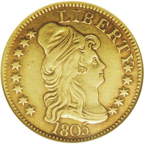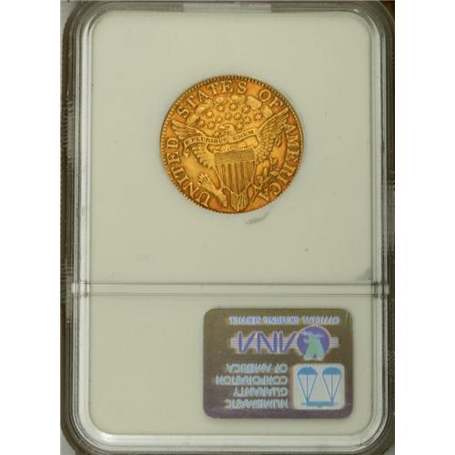 <B>1805 $5 AU55 NGC.</B></I> Close Date, Breen-6445, BD-2, R.4. The appealing surfaces are honey-gold and deeper amber-gold at the rims and brownish around the devices. The 1 and the 5 in the date touch the bust, star 9 touches the Y, and star 13 touches the bust. On the reverse, all the T's lack their lower-right serifs. No singularly distracting abrasions are noted on the surfaces of this pleasing Choice AU example, although some light field chatter is seen on each side.<BR><BR><b>Shipping:</b> Coin/Currency (<a target="_blank" href="http://www.heritageauctions.com/common/shipping.php">view shipping information</a>)