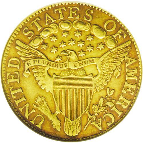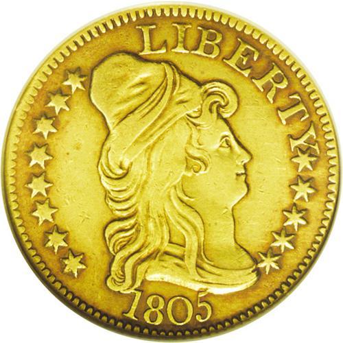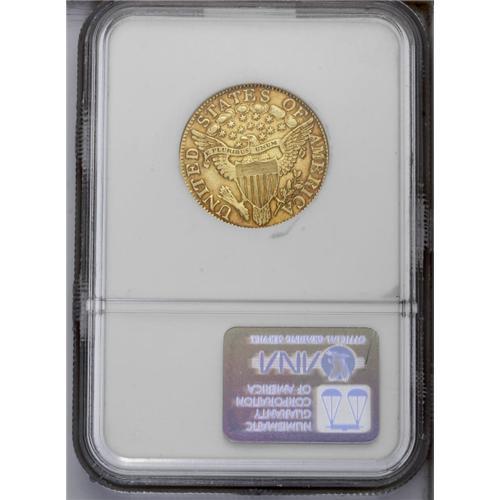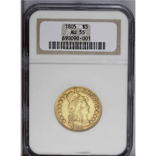 <B>1805<$5> AU55 NGC.</B></I> Close Date, Breen-6445, B. 3-D, Miller-73, R.4. The appealing surfaces are honey-gold and deeper amber-gold at the rims and brownish around the devices. The 1 and the 5 in the date touch the bust, star 9 touches the Y, and star 13 touches the bust. On the reverse, all the T's lack their lower-right serifs. No singularly distracting abrasions are noted on the surfaces of this pleasing Choice AU example, although some light field chatter is seen on each side.<BR><I>From The Antigo Collection.</B></I>