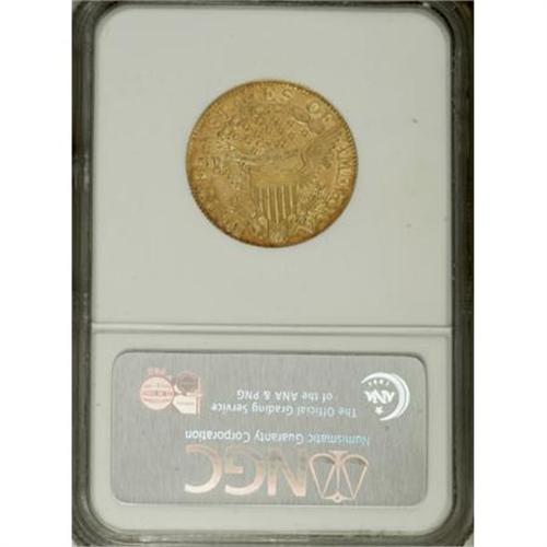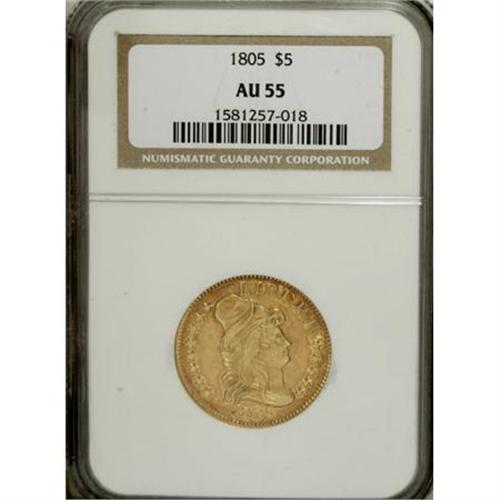 <B>1805 $5 AU55 NGC. CAC.</B></I> Close Date, Breen-6445, BD-1, High R.3. This early half eagle has substantial remaining luster, and the attractive peach-gold toning deepens to hints of cherry-red toward the rims. A well struck example with an impressively smooth reverse. The obverse has a few thin marks on the neck, jaw, and nearby field. A spur from the leaftip near the C in AMERICA identifies this scarce die marriage.<BR><BR><B>Coin Engraver:</B> Robert Scot<BR><BR><b>Shipping:</b> Coins & Currency (<a target="_blank" href="http://www.heritageauctions.com/common/shipping.php">view shipping information</a>)