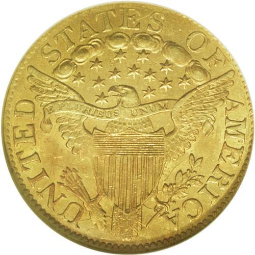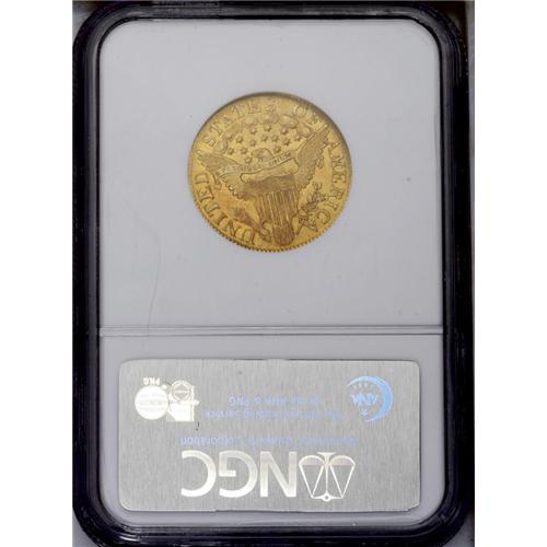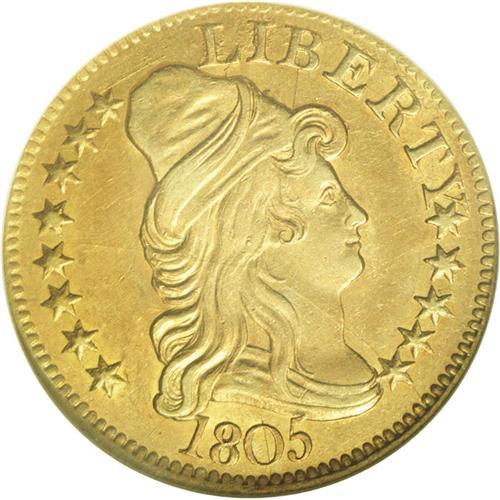 <B>1805 $5 AU58 NGC.</B></I> Close Date, Breen-6445, B. 3-B, Miller-74, R.5. A pleasingly sharp example that shows each breast feather clearly. The left border of the shield has a hint of softness, but the strike is otherwise exemplary. Luster is pervasive across the reverse, and broken on the obverse only on the cheek and field. No distracting marks are detected. Breen 3-B is identified by two features: a star touches the Y in LIBERTY, and the left shield corner has a small vertical spike. Struck from prominently clashed, cracked, and rusted dies.