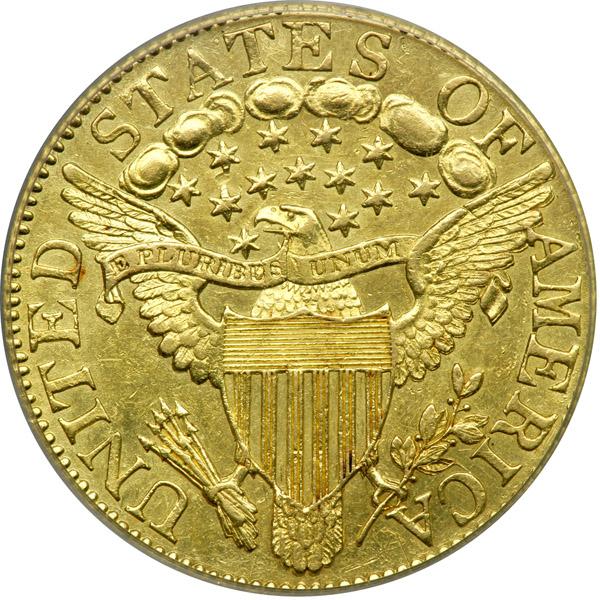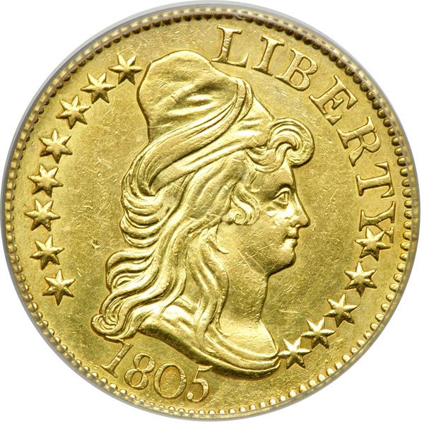 1805. . BD-1 Close Date, Breen-6445. PCGS Genuine. Our grade is Sharpness of AU-58 and cleaned. The first die pair listed in Dannreuther, the date has a Perfect 1, with numerals close. On the reverse, the defining feature is a leaf that touches I in UNITED (on BD-2, the I is well away); IT close. This is the most available variety of 1805 with perhaps 200 known. It is from the only 1805 obverse die with the left foot of the 1 intact (PCGS # 8088) .