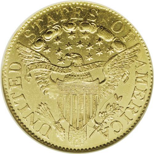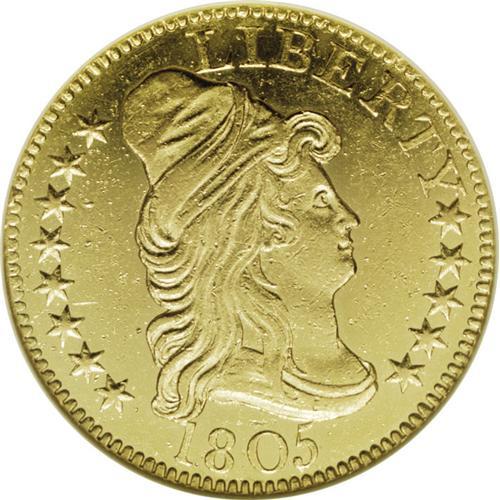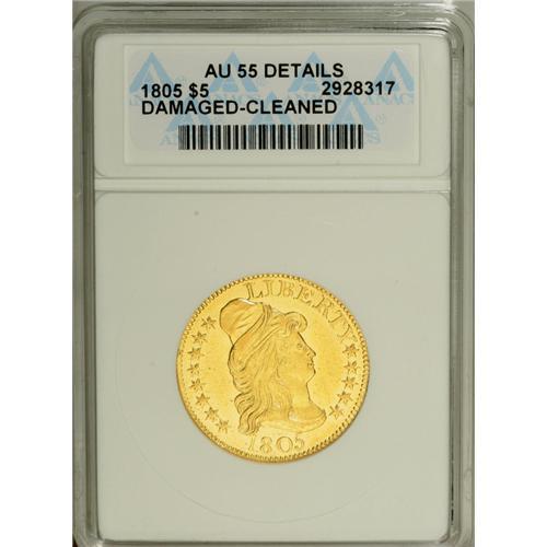 <B>1805 $5 --Damaged, Cleaned--ANACS. AU55 Details.</B></I> Wide Date, Breen-6444, BD-3, High R.5. 1 of date missing lower left foot, tip of flag of 5 touches bust, and star 9 is near the Y in LIBERTY. Considerable luster resides on the yellow-gold surfaces that have been lightly cleaned. Several minute indentations, seemingly purposely perpetrated, are also scattered about, especially on the obverse. Nice detail is noted on the design elements.<BR><BR><b>Shipping:</b> Coin/Currency (<a target="_blank" href="http://www.heritageauctions.com/common/shipping.php">view shipping information</a>)