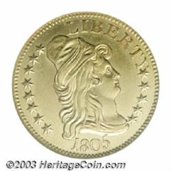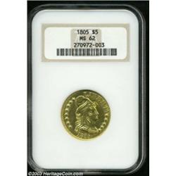 <table><tr><td><TABLE cellSpacing=0 cellPadding=0 width="100%" bgColor=#000000 border=0><TBODY> <TR><TD width="100%"><TABLE cellSpacing=1 cellPadding=3 width="100%" border=0><TBODY><TR><TD width="100%" bgColor=#79735c><FONT face=arial color=#ffffff size=3><B>Description</B> </FONT></TD></TR><TR><TD width="100%" bgColor=#ffffff><FONT face=arial size=2><B>1805 $5 MS62 NGC.</B></I> Close Date, Breen-6445, B. 3-D, Miller-73, R.4. The eagle's right (facing) wing appears to be die doubled, and the upper right serif of the T in LIBERTY is recut. A faintly die crack (as made) from the center of the bust through the 0 in the date. A magnificently struck example that only lacks complete definition within the centers of the high relief stars. The luster is bright and semi-prooflike, and only a few very wispy slide marks on the obverse prevent a higher grade. </FONT></TD></TR></TBODY></TABLE></TD></TR></TBODY></TABLE><BR><A name=PricesRealized></A><TABLE cellSpacing=0 cellPadding=0 width="100%" bgColor=#000000 border=0><TBODY><TR><TD width="100%"><TABLE cellSpacing=1 cellPadding=3 width="100%" border=0><TBODY><TR><TD width="100%" bgColor=#79735c><A name=PR><FONT face=arial color=#ffffff size=3><B>Previous Prices from Heritage Auctions</B> </FONT></A></TD></TR><TR><TD bgColor=#f6f6ed><TABLE cellSpacing=0 cellPadding=0 width="100%" border=1><TBODY><TR><TD align=middle width="33%"><B>Date</B></TD><TD align=middle width="33%"><B>Service</B></TD><TD align=middle width="33%"><B>Price</B></TD></TR><TR bgColor=whitesmoke><TD width="33%"><B>01/10/1998</B></TD><TD width="33%">NGC</TD><TD width="33%">$8,050.00</TD></TR><TR bgColor=whitesmoke><TD width="33%"><B>01/06/1996</B></TD><TD width="33%">PCGS</TD><TD width="33%">$7,260.00</TD></TR><TR bgColor=whitesmoke><TD width="33%"><B>06/02/1995</B></TD><TD width="33%">NGC</TD><TD width="33%">$6,600.00</TD></TR><TR bgColor=whitesmoke><TD width="33%"><B>02/03/1993</B></TD><TD width="33%">PCGS</TD><TD width="33%">$7,425.00</TD></TR><TR bgColor=whitesmoke><TD width="33%"><B>08/01/1999</B></TD><TD width="33%">PCGS</TD><TD width="33%">$17,250.00</TD></TR><TR bgColor=whitesmoke><TD width="33%"><B>06/01/1997</B></TD><TD width="33%">PCGS</TD><TD width="33%">$7,975.00</TD></TR><TR bgColor=whitesmoke><TD width="33%"><B>02/16/2000</B></TD><TD width="33%">PCGS</TD><TD width="33%">$7,073.00</TD></TR></TBODY></TABLE></TD></TR><TR><TD bgColor=#ffffff><FONT face=arial size=1 ?>PLEASE NOTE: All prices realized reflect the final hammer price PLUS the buyer's premium in auctions that charge a buyer's premium. Each item has a notation at the top of the listing indicating whether that lot included a buyer's premium. Example: A item that sells with a final hammer price of $100 and a 20% buyer's premium will display with a price realized of $120. All information listed is intended to be as accurate as possible, but errors are possible. Please use this guide carefully and inform us of any inaccuracies. </FONT></TD></TR></TBODY></TABLE></TD></TR></TBODY></TABLE><BR><TABLE cellSpacing=0 cellPadding=0 width="100%" bgColor=#000000 border=0><TBODY><TR><TD width="100%"><TABLE cellSpacing=1 cellPadding=3 width="100%" border=0><TBODY><TR><TD width="100%" bgColor=#79735c colSpan=6><FONT face=arial color=#ffffff size=3><B>Price Guide*</B> </FONT></TD></TR><TR bgColor=#f6f6ed><TD align=middle><B>Grade</B> </TD><TD align=middle><B>Coin World<BR>(Trends)</B> </TD><TD align=middle><B>Numismedia<BR>Retail</B> </TD><TD align=middle><B>Numismedia<BR>Wholesale</B> </TD><TD align=middle><B>Coin<BR>Universe</B> </TD><TD align=middle><B>Heritage<BR>Value Index</B> </TD></TR><TR bgColor=#ffffff><TD align=middle>61</TD><TD align=right>---</TD><TD align=right>---</TD><TD align=right>$6,625.00</TD><TD align=right>$8,250.00</TD><TD align=right>$6,435.00</TD></TR><TR style="FONT-WEIGHT: bold" bgColor=#cccfdd><TD align=middle>62</TD><TD align=right>$10,000.00</TD><TD align=right>---</TD><TD align=right>$7,650.00</TD><TD align=right>$9,425.00</TD><TD align=right>$7,477.50</TD></TR><TR bgColor=#ffffff><TD align=middle>63</TD><TD align=right>$14,750.00</TD><TD align=right>---</TD><TD align=right>$10,850.00</TD><TD align=right>$16,000.00</TD><TD align=right>$10,328.75</TD></TR><TR bgColor=#ffffff><TD colSpan=6><FONT size=1>*All information listed is intended to be as accurate as possible, but errors are possible. No item may be returned or refused based on this information which is provided as a service to our customers. You should contact each pricing source directly to determine the accuracy of this information. </FONT></TD></TR></TBODY></TABLE></TD></TR></TBODY></TABLE><BR><TABLE cellSpacing=0 cellPadding=0 width="100%" bgColor=#000000 border=0><TBODY><TR><TD width="100%"><TABLE cellSpacing=1 cellPadding=3 width="100%" border=0><TBODY><TR><TD width="100%" bgColor=#79735c><FONT face=arial color=#ffffff size=3><B>Population Guide</B> </FONT></TD></TR><TR bgColor=#ffffff><TD align=middle><!-- Begin Output of Population Grid--><TABLE cellSpacing=0 cellPadding=0 width="100%" border=0><TBODY><TR><TD vAlign=center><TABLE cellSpacing=0 width="100%" border=1 cellsadding="3"><TBODY><TR><TD vAlign=center><TABLE cellSpacing=0 cellPadding=3 width="100%" border=1><TBODY><TR><TD vAlign=center align=middle bgColor=#f0f1e8 colSpan=2 <CENTER><FONT face=Arial size=2><B>PCGS Pop </B></FONT><CENTER></CENTER></TD><TD vAlign=center align=middle bgColor=#f0f1e8 colSpan=2><CENTER><FONT face=Arial size=2><B>NGC Pop</B></CENTER></FONT></TD></TR><TR><TD vAlign=center><FONT face=Arial size=2>(62)</FONT> </TD><TD vAlign=center align=right><FONT face=Arial size=2>30</FONT> </TD><TD vAlign=center><FONT face=Arial size=2>(62)</FONT> </TD><TD vAlign=center align=right><FONT face=Arial size=2>34</FONT> </TD></TR><TR><TD vAlign=center><FONT face=Arial size=2>(>62)</FONT> </TD><TD vAlign=center align=right><FONT face=Arial size=2>51</FONT> </TD><TD vAlign=center><FONT face=Arial size=2>(>62)</FONT> </TD><TD vAlign=center align=right><FONT face=Arial size