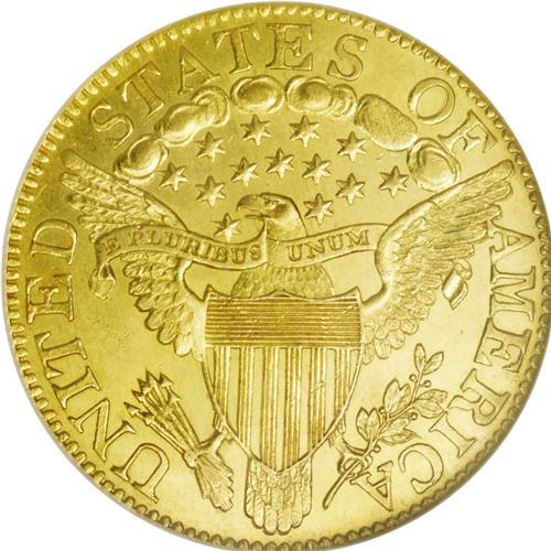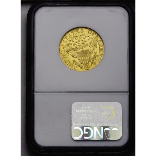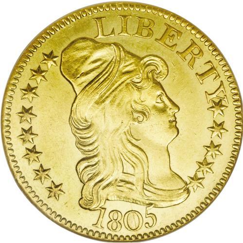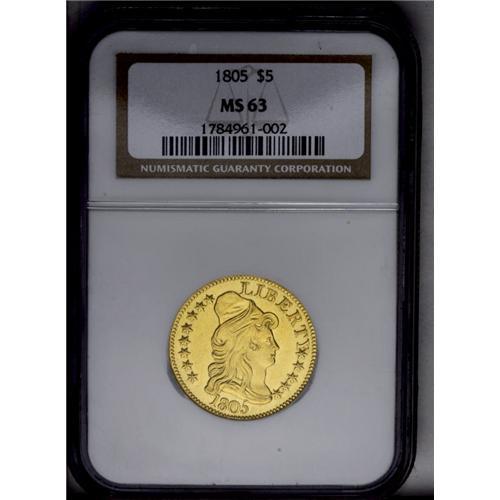 <B>1805<$5> MS63 NGC.</B></I> Close Date, Breen-6445, B. 3-D, Miller-73, R.4. The 1 touches the curl, star 9 touches the Y, or nearly so, at two places, star 13 touches the bust, and stars 11-13 touch each other. On the reverse, the T's lack their lower right serifs, and ST is recut. Stars 3, 8, and 12 are in a straight line. This is a really lovely coin in an early die state, as the obverse die crack through the lower curls, the drapery, and through the 0 to the rim is faintly evident, and there is as yet no trace of the reverse rim cud above the U in UNITED. This piece is extremely well struck, with excellent mint luster, and the lack of die defects and abrasions makes it look like a coin from the late 19th century. Only under a loupe do a few light abrasions on the cheek appear. For early gold specialists, this is one piece that will definitely not require upgrading later on.<BR><I>From The Frank Schwerin Collection.</B></I> <BR><BR><B>Import
