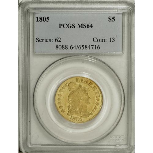 1805 $5 MS64 PCGS. Close Date, Breen-6445, BD-2, R.4.
