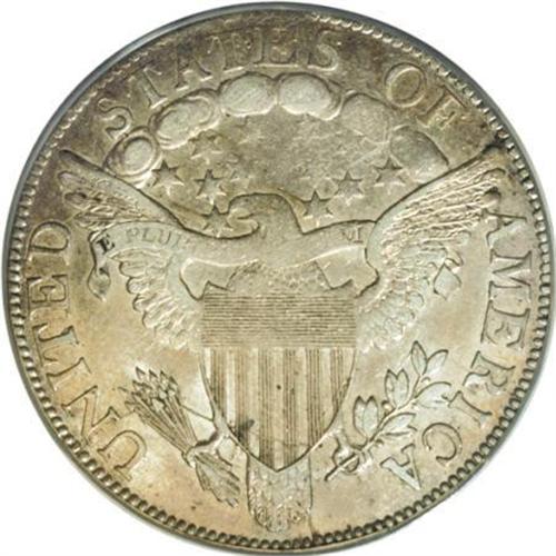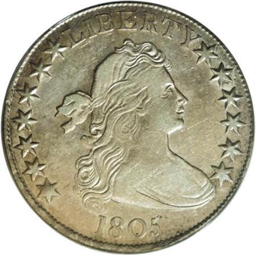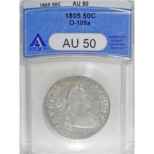 <B>1805 50C AU50 ANACS.</B></I> O-109a, R.4. A fine example of this later die state O-109 that is characterized by the footless F in OF and the broken inner right serif of the A's on the reverse. As with the coin above, the obverse has light cracks that join most of the stars on each side. The lower part of the reverse has a heavy crack from the border through the rightmost tail feather to the shield, that curves through vertical stripes 5 and 6 to the right shield border, with an equally heavy branch that extends left to the arrows, curves down to the left side of the N and to the border. A faint branch of this second crack extends through the field left of the shield to the third wing feather. Another crack begins at the border through the right side of R in AMERICA to the top leaf point.<BR> Although somewhat bluntly struck, especially on the upper stars on the reverse, this pleasing piece has light silver surfaces with considerable luster and traces of gold toning on the reverse.<BR> With a 53/53 the finest example listed on Stephen Herrman's <I>Auction & Mail Bid Prices Realized</B></I>, this AU50 should be second finest known. <BR> Haseltine-5; Beistle 4-E; Overton-17; PCGS# 39283; Encyclopedia-4580.<BR><I>Ex: Sheridan Downey (1/2007).<BR>From The Westmoreland County Collection of Early Bust Halves, 1794-1807.</B></I><BR><BR><B>Coin Engraver:</B> Robert Scot<BR><BR><b>Shipping:</b> Coins & Currency (<a target="_blank" href="http://www.heritageauctions.com/common/shipping.php">view shipping information</a>)
